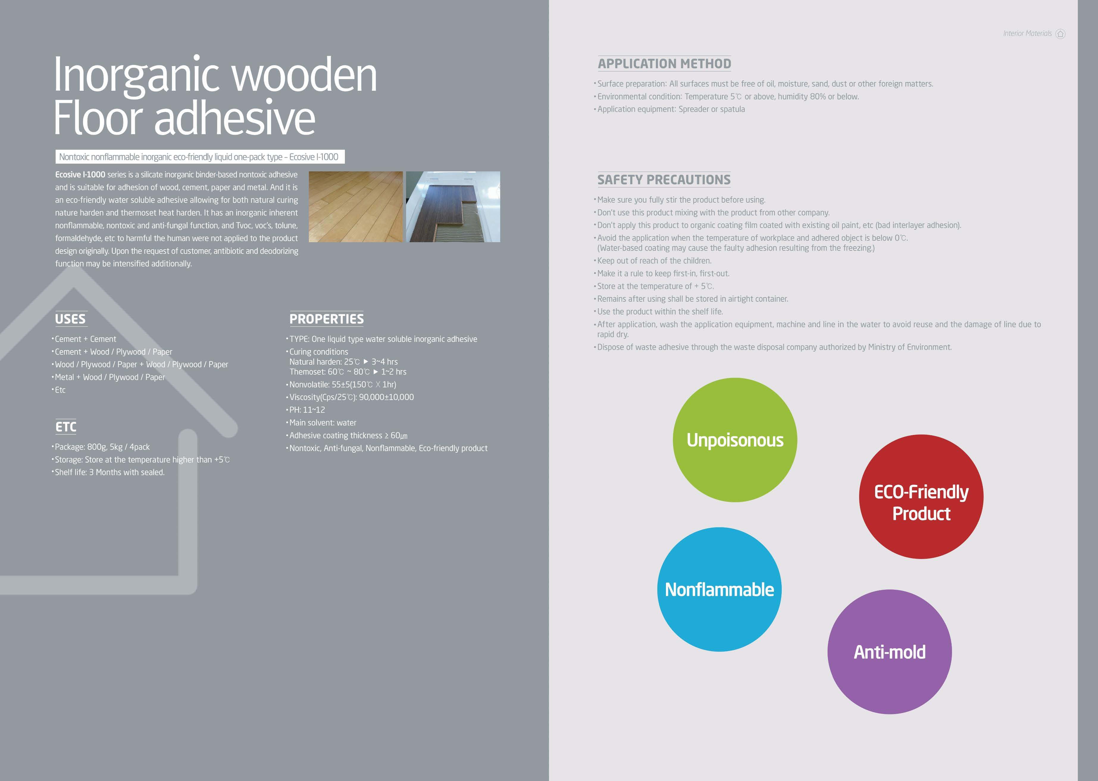 Ecosive I-100 series is a silicate inorganic binder-based nontoxic adhesive and is suitable for adhesion of wood, cement, paper and metal. And it is an eco-friendly water soluble adhesive allowing for both natural curing nature harden and thermoset heat harden. It has an inorganic inherent nonflammable, nontoxic and anti-fungal function, and Tvoc, voc’s, tolune, formaldehyde, etc to harmful the human were not applied to the product design originally. Upon the request of customer, antibiotic and deodorizing function may be intensified additionally.